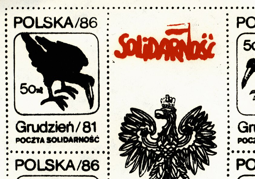 On the right, Polish opposition samizdat stamps featuring two crows, the Solidarity logo, the eagle from the coat of arms of Poland,