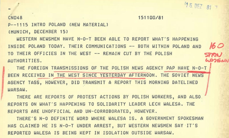 On that day, the military took over power in Poland, and basically sealed off the country from the outside world. Radio Free Europe (RFE), in the previous one and a half year, could access information on Polish affairs from a wide range of sources. After the Gdańsk agreement signed on August 31, 1980, which legalized the Solidarity free trade union, news in the Polish state media became much more pluralized and fact-based compared to other Eastern Bloc countries. Furthermore, a large contingent of foreign correspondents was present in the country, and the Polish opposition itself was sending dispatches to the West on a daily basis. After December 13, the most common phrase in RFE reports became, “little is known for certain.” Most of the Solidarity journalists were arrested, the remaining foreign press were struggling to gather reliable information, while the official TV, radio, and newspapers of the country were broadcasting propaganda.