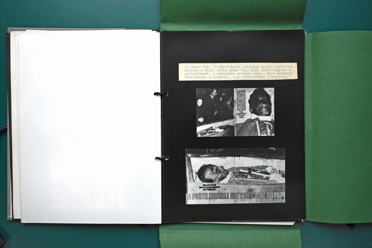 The Hungarian Popiełuszko memorial book, with photos from the Western press depicting the priest’s corpse.