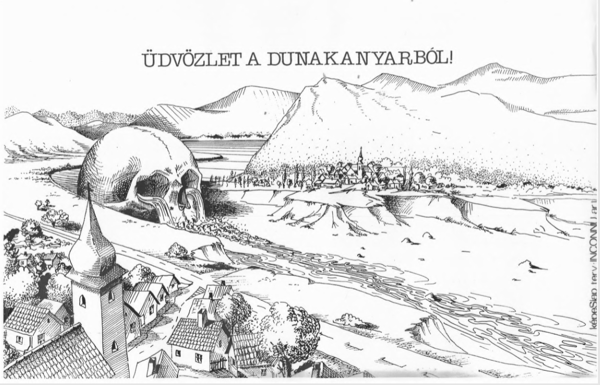 One of the best-known Danube-related work of the Inconnu was the graphic work entitled Greetings from the Danube Bend!, in which a skull drifts down the river around Nagymaros. This image was published on the back page of the 10th anniversary-publication of the group, and later lived its own life by being present in leaflets independent from the Inconnu.