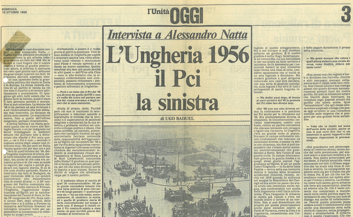 An 1986 interview with PCI leader Alessandro Natta in L’Unitá, the official daily of the party. As the first official comment on the Hungarian Revolution of 1956 from the Italian communists, Natta expressed that the execution of Imre Nagy was “an unjust and inhuman act,” and his party had “erred” by not denouncing the Soviet crushing of the uprising.