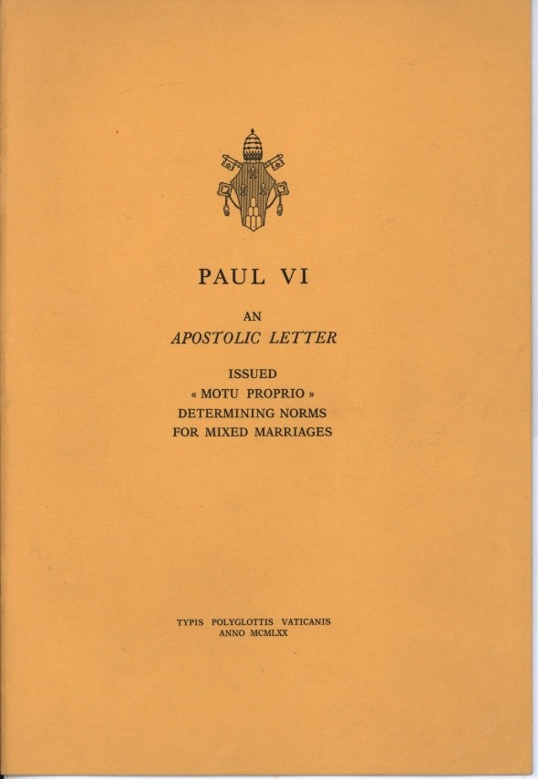 On the left, the apostolic exhortation Catechesi Tradendae by Pope John Paul II. On the right, the apostolic letter Matrimonia Mixta by Paul VI.