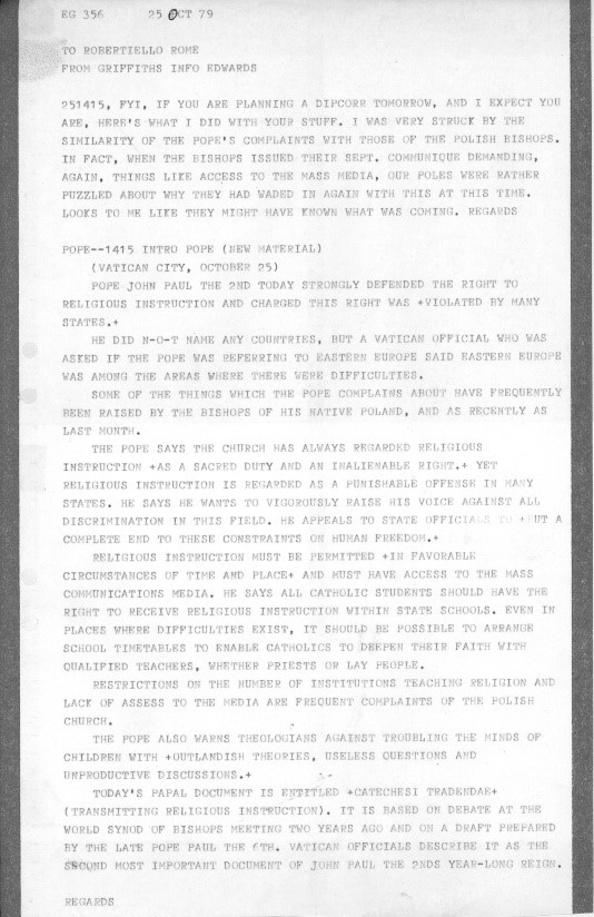 According to J. F. Brown, RFE was collecting news from the Vatican to spread information about the Pope’s activities in the countries behind the Iron Curtain, an activity that intensified even more after the election of Pope John Paul II, the first Pope in history coming from a communist country. On this occasion, RFE was the main information channel reporting the Pope’s activities to the Poles. Furthermore, RFE collected news about the Italian Communist Party (PCI), which RFE analyst Kevin Devlin, “the world’s greatest expert on the Western communist parties,”2 considered a major, independent member of the international movement.