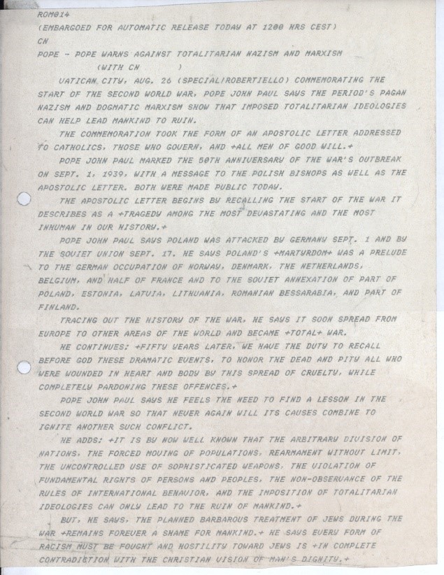 This series covers the time span 1960–1992, and mainly consists of newspaper clippings about the public activities of the Popes (i.e. audiences, speeches, trips abroad, etc.) and RFE’s internal telex communications. There are also some official publications issued by the Vatican Polyglot Press, such as the apostolic exhortations and apostolic letters written by the Popes.