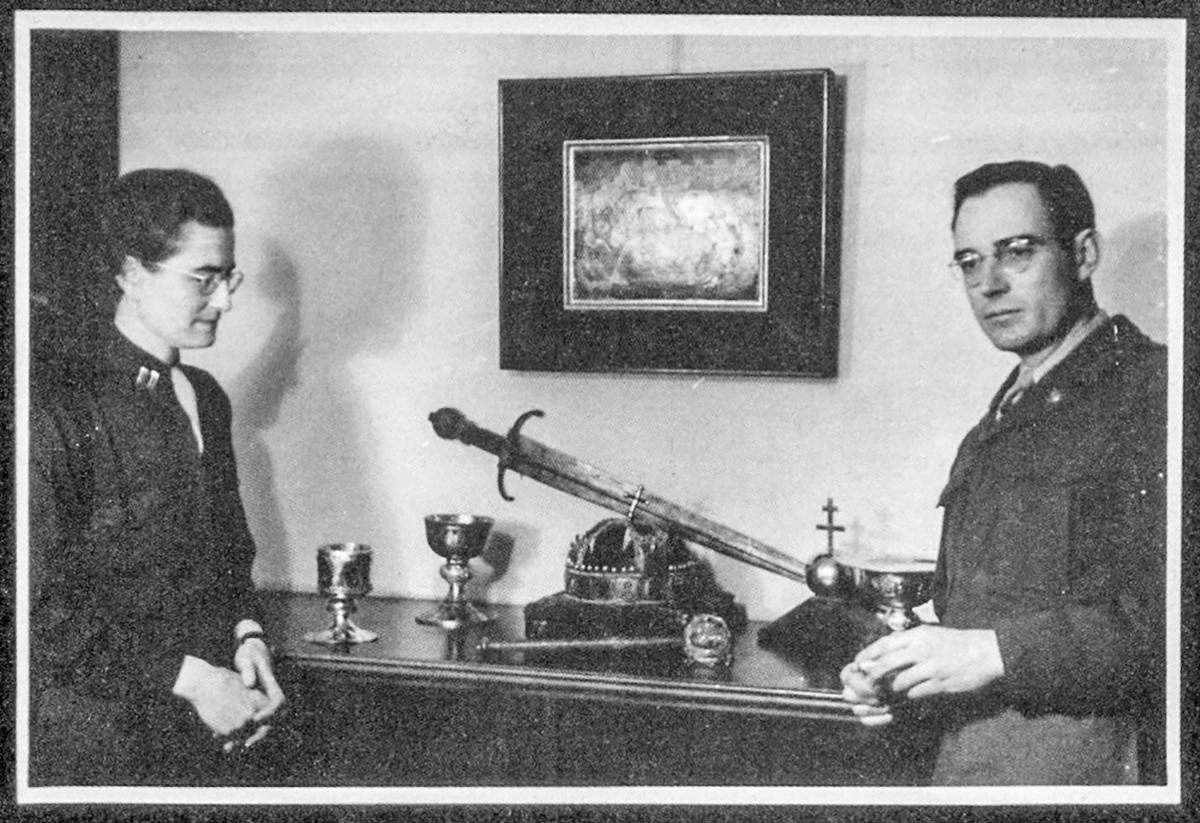 Edith Standen and Patrick J. Kelleher, Monuments, Fine Arts & Archives Administration experts with the regalia, 1946. Kelleher, art historian at Princeton University, wrote his doctoral thesis on the Holy Crown, he published his research in 1951. Kelleher also accompanied the Hungarian experts identifying the insignia in 1977.