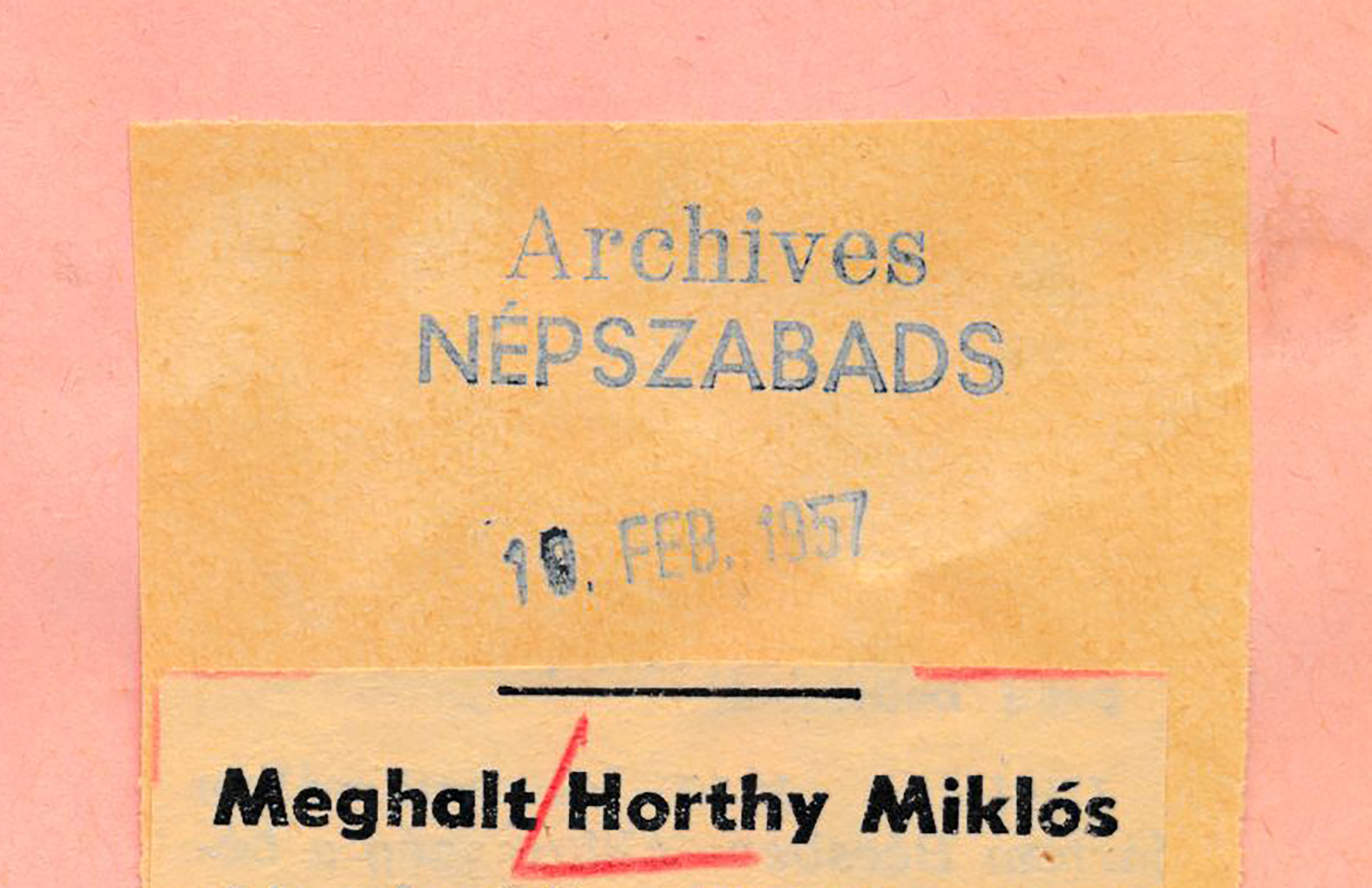 Unsurprisingly, four months after suppressing the 1956 Revolution, the Hungarian press was not keen on discussing the event; although the party daily Népszabadság (People’s freedom) did report the death of “the former leader of the Hungarian counterrevolution,” the short item only appeared on page 9 of the February 10 issue, among international news. The piece highlights that it was Horthy, who drew Hungary into World War 2, during which the country became Germany’s “last henchman”; then, in 1956, in the “second counterrevolution,” Horthy attempted to have a part again.