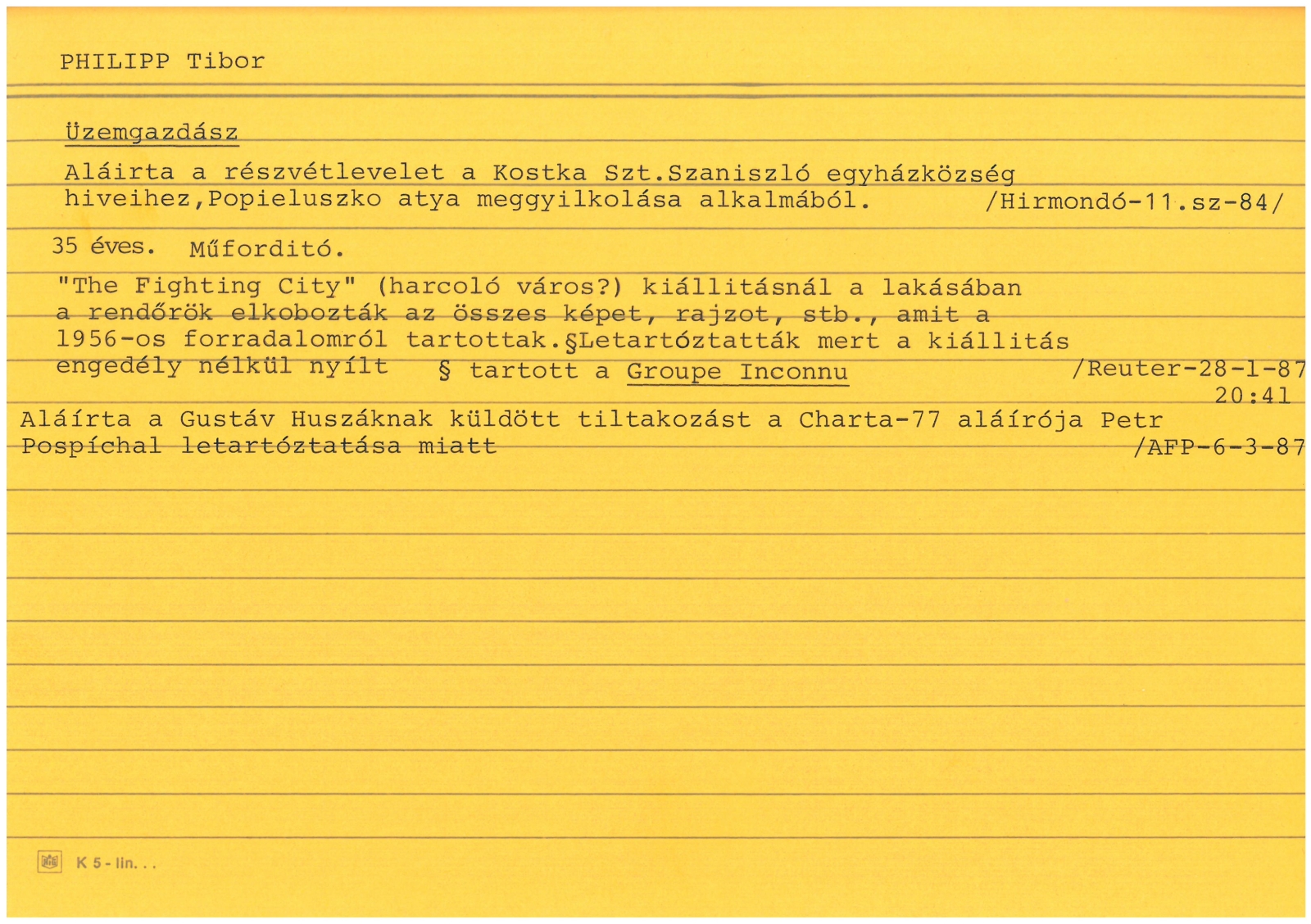 Tibor Philipp donated a significant collection to the Blinken OSA. Related to the activities of the Inconnu Group and the 1980s democratic opposition, the materials include samizdat publications and periodicals, ephemera and graphic works, pins and stickers; the collection even comprises documents on political happenings realized in private apartments or in public spaces, such as invitations, programs, speeches. The detailed description of the collection is available in the catalog.