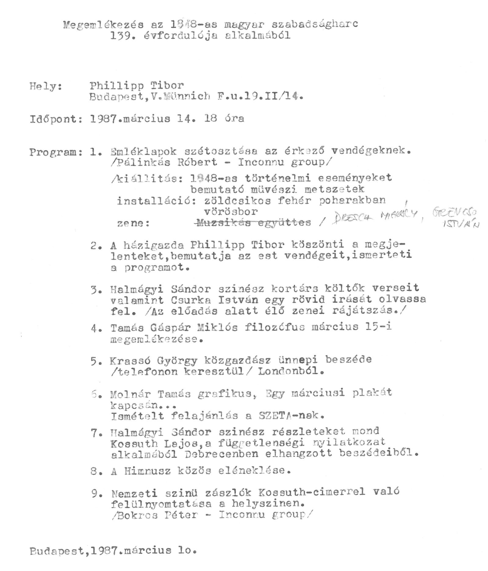 Program of a March 15 celebration organized in Tibor Philipp's apartment in 1987, and a penalty notice for forbidden fundraising.
