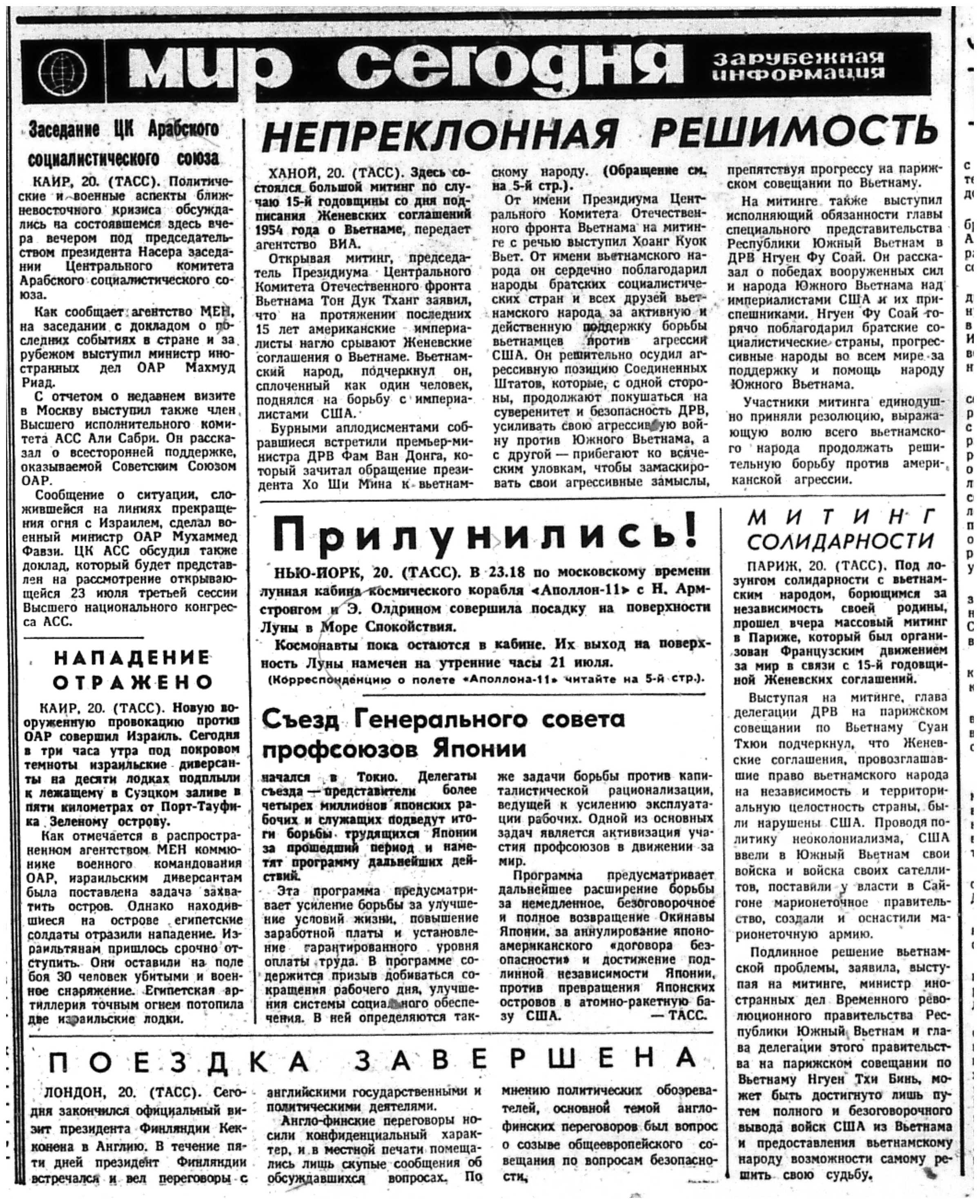 2. The lower part of Pravda first page on July 20, with a short paragraph, surrounded by six other small international news, entitled “Prilunilis” i.e. “Landed on the Moon”, continued on page 5.