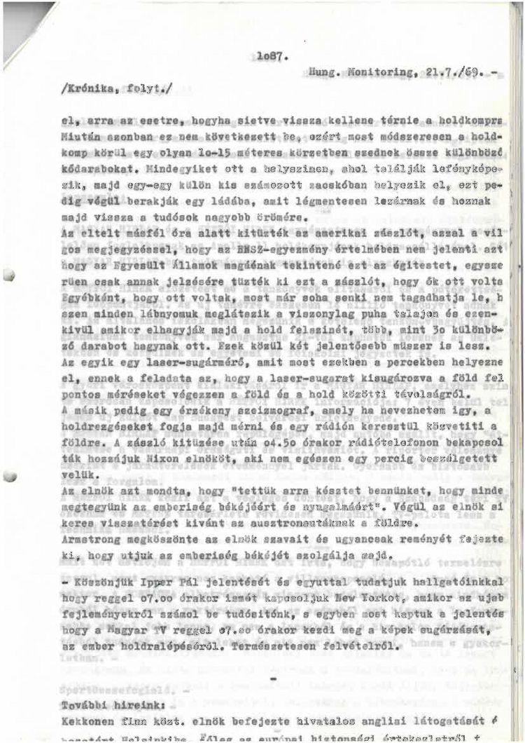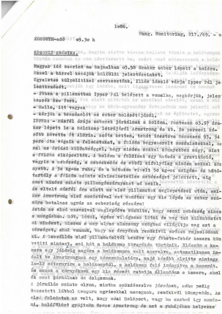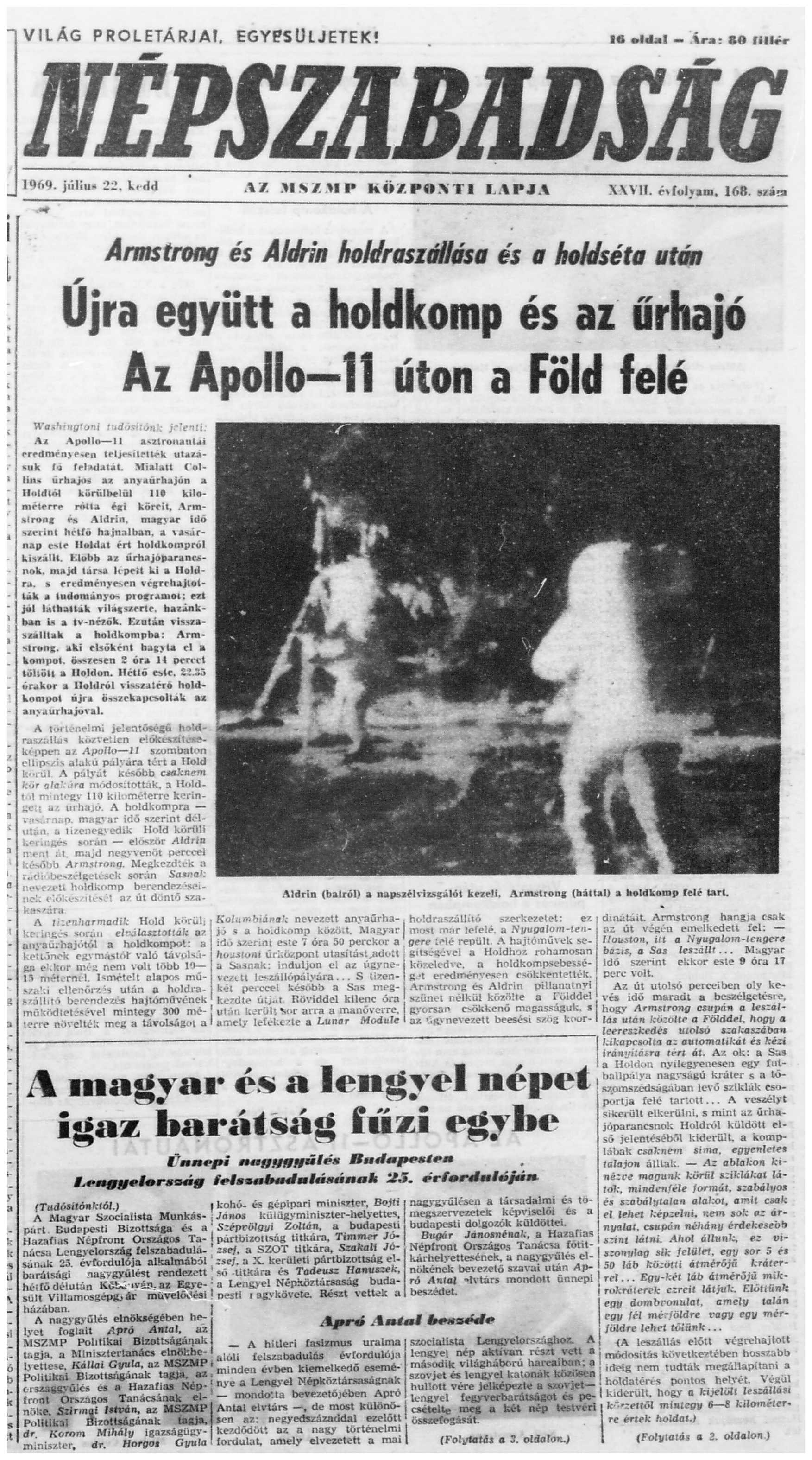 3. The two-page report in Népszabadság on July 22. While the print press was one day late because in those times they did not appear on Mondays, listeners of Radio Kossuth were informed in the earliest morning news on Monday, July 21 that “People have been walking the Moon for one and a half hours!”