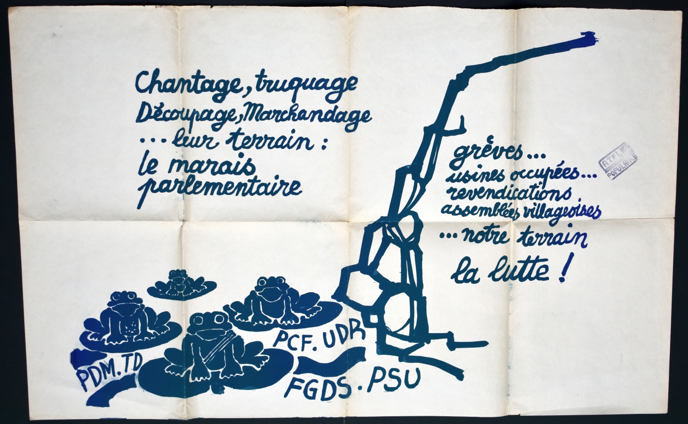 The poster bears the stamp of Atelier Populaire. "Marsh" is a reference to the 1792–93 French National Convention of the French revolution. It was made up of three big groups, the Mountain of the radical populist Jacobins, the moderate liberal Girondists, and the Marsh or Toads constituting the majority. The latter voted with either the Girondists or the Mountain, depending on the issue.