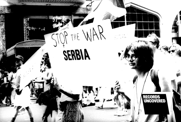 Photo of Lepa Mlađenović at a demonstration, 1994. Mlađenović has been one of the most outspoken lesbian activists in former Yugoslavia and Serbia, and an anti-war activist. She was also the founder of the first SOS phone line for women and children victims of violence in Serbia, which was of key importance for the development of feminist and lesbian activism in the country during the war. Her article Notes of a Feminist Lesbian during War is the most illustrative expression of the specific socio-political positionality of lesbians during the Yugoslav War.
