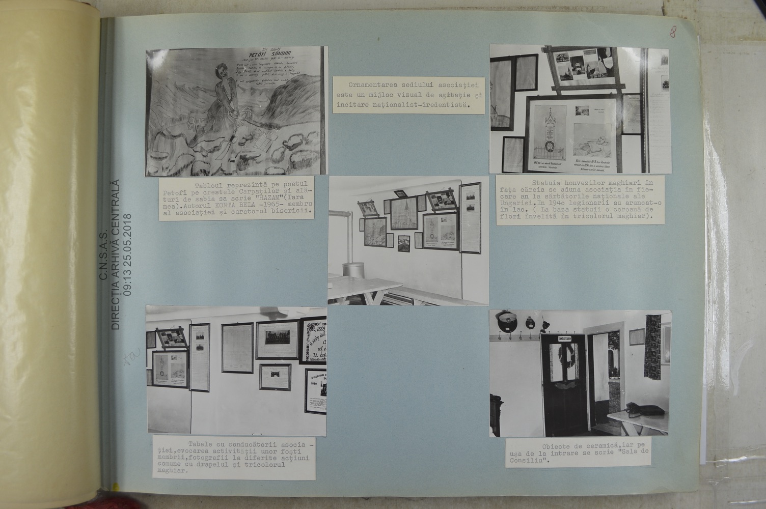 The choir was accused of nurturing nationalist-irredentist ideals behind the façade of their church choir and of being hostile to the Socialist Romanian state. The album was carefully designed to support this claim. It starts with a five and a half page report on the history and activity of the choir stating that the choir’s real aim was to maintain the national identity of the local Hungarian minority and to instil Hungarianess in the next generation. The reporting officer made efforts to portray the choir as a conspiratory group not independent of other equally dubious Hungarian organisations. He claimed that it had negative influence on the discipline of the local community. Crime scene photographs taken by the secret police capture the group’s meeting room, focusing on its Hungarian patriotic decoration, while reproductions of confiscated documents (minutes of meetings, financial reports, membership lists, correspondances, musical scores) are amended with explanatory captions that point to the nationalistic nature of the choir.