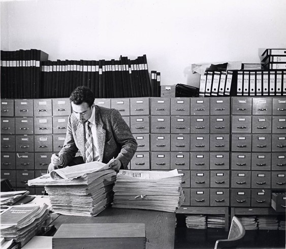 For a radio station employing migrants and situated kilometers away from the Communist bloc (in Munich), technologies and devices were there to reduce noise and human error, but in what sense? A laboratory type of work (rather than simply a journalistic one) is revealed by the photos. Chemical metaphors suggest a process of distillation: large amounts of data are transformed into information through strictly controlled operational phases of production. One caption says that “1,500,000 words are boiled down to a running file of just 100,000 words” that moves around the units. Radio Free Europe could thus be viewed as part of a larger set of activities, partly scientific in nature, designed to make sense of the inaccessible Soviet bloc. This ideal type of Cold War rationality has been elaborated by Lorraine Daston, Paul Erickson and their collaborators in their 2013 book, How Reason almost Lost Its Mind. The Strange Career of Cold War Rationality. It basically comprises formalization and transversal generalizations, across contexts and issues. Some of its tenets can be traced visually in the RFE photos as well: the reduction of problems to typified events, a transversal way of dealing with topics across languages and cultures, a propensity for cramming issues into pre-designed thematic inventories, standardized working postures and attitudes. As in the case of their more mathematical counterparts employed by RAND, techniques were considered to be independent of the problems to which they would be applied and valid for whichever technician would work with them.