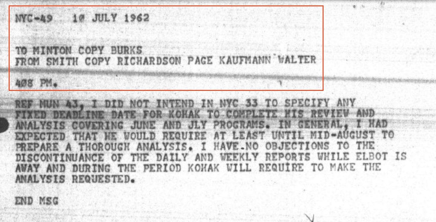 ・First of all, as you see on the top left, the header shows the abbreviations of the institutions: either NYC or MUN, which indicate the sending institution(s). In this case, it is NYC, this is a message from the Free Europe Committee office in New York, and the Radio Free Europe office in Munich (MUN) would be the receiving institution.