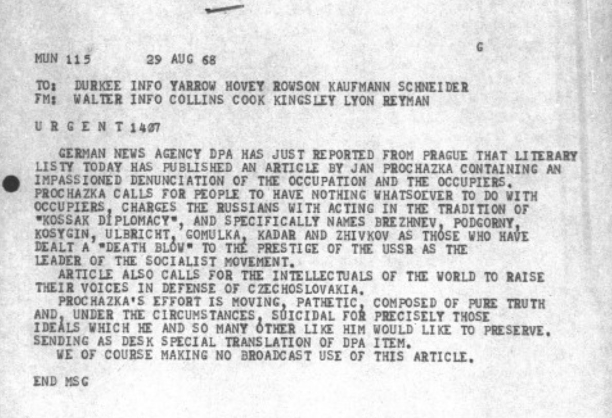 The message sent three days after the Invasion of the Czechoslovak lands by the Warsaw Pact Army reported “an impassioned denunciation of the occupation and the occupiers”, written by Jan Procházka, the famous author. Some of the messages might not be full of “new facts”, but we can see day by day the development of journalistic, social and contemporary analyses of historical events.