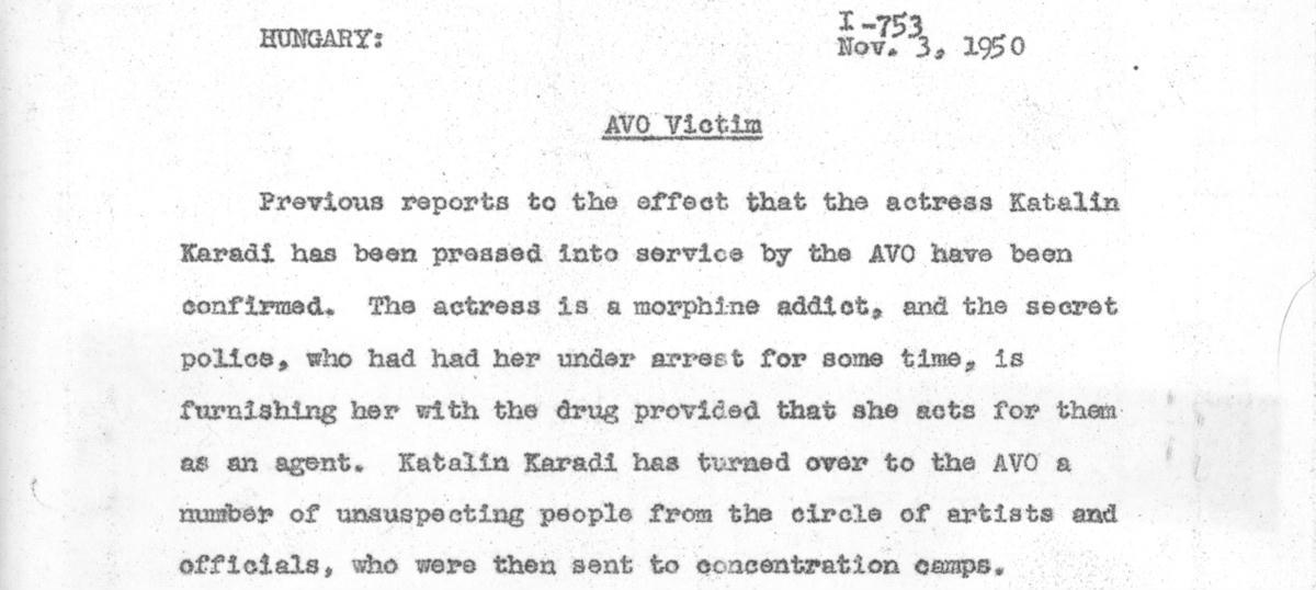 Most probably, Katalin Karády was not a morphine addict, and it’s difficult to believe that someone who had been awarded the Righteous Among the Nations title by Yad Vashem for saving Jews, would hand over colleagues to the State Defense Department. Yet, the literature attacking her personality and legacy is extensive; throughout her career, she was subject to jealousy and hostility, with adversaries striving to discredit her both in Hungary and abroad even after her 1952 emigration. Rather than backing a moral judgement on Karády, the above document is a symbol for her life. We know that she was beaten by Nazis in 1944, that she was blackmailed by the State Defense Department 5–6 years later, and that she did not receive a visa to the US until 1968. The latter fact may be explained by the RFE Information Item published now in the collection, as the State Department, the CIA, or the immigration enforcement had, so to say, direct access to it at the New York office of RFE, a government-funded organization. Everyone can make their own conclusions.