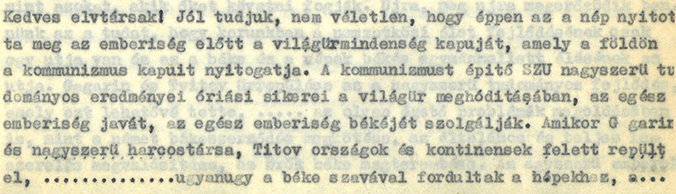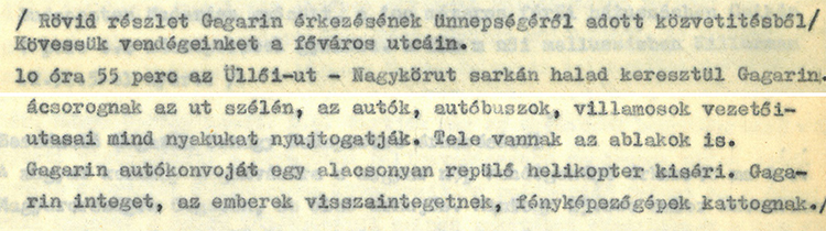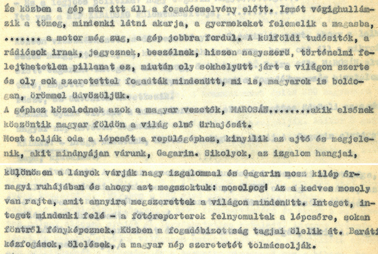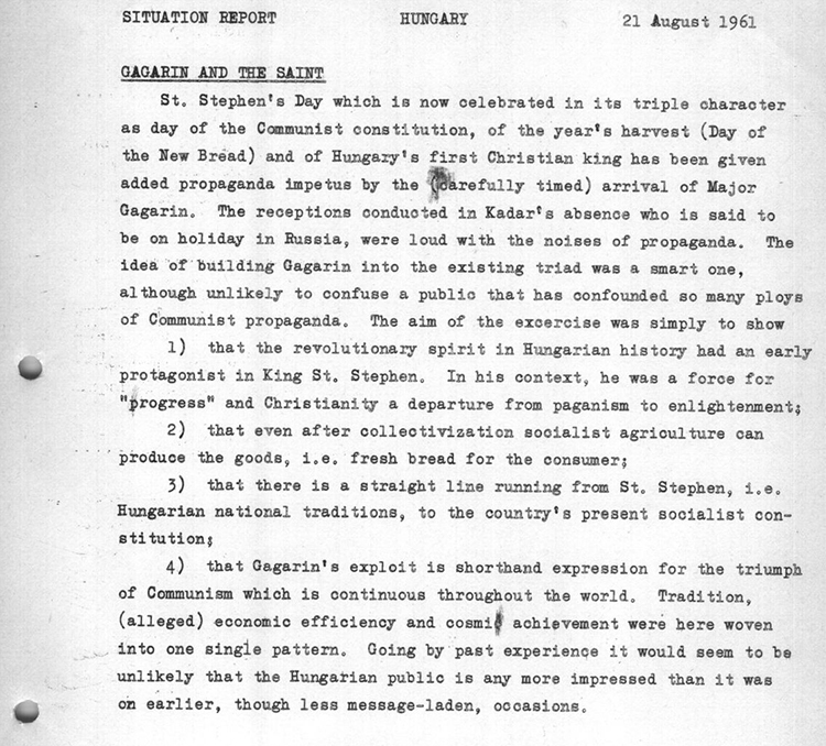 The way the above was realized in practice, i.e. how propaganda shaped Gagarin's Hungarian visit is captured in the Hungarian Radio transcripts prepared at the RFE Research Institute, and preserved at the Blinken OSA.