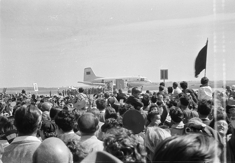“The staircase is moved to the airplane, the door opens, and he, Gagarin, whom we all waited for, appears. People scream in excitement, especially the ladies are excited about him, and Gagarin, wearing uniform, leaves the plane, and as expected: he is smiling!”