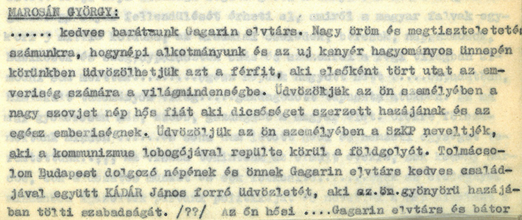 “Dear friend, Comrade Gagarin. It is great pleasure and honor to us, that on the day of our people's constitution and the traditional celebration of the new bread, we can welcome the man who pioneered into infinity. In your personage, we welcome the heroic son of the Soviet people, who brought glory to his homeland and to humanity.”