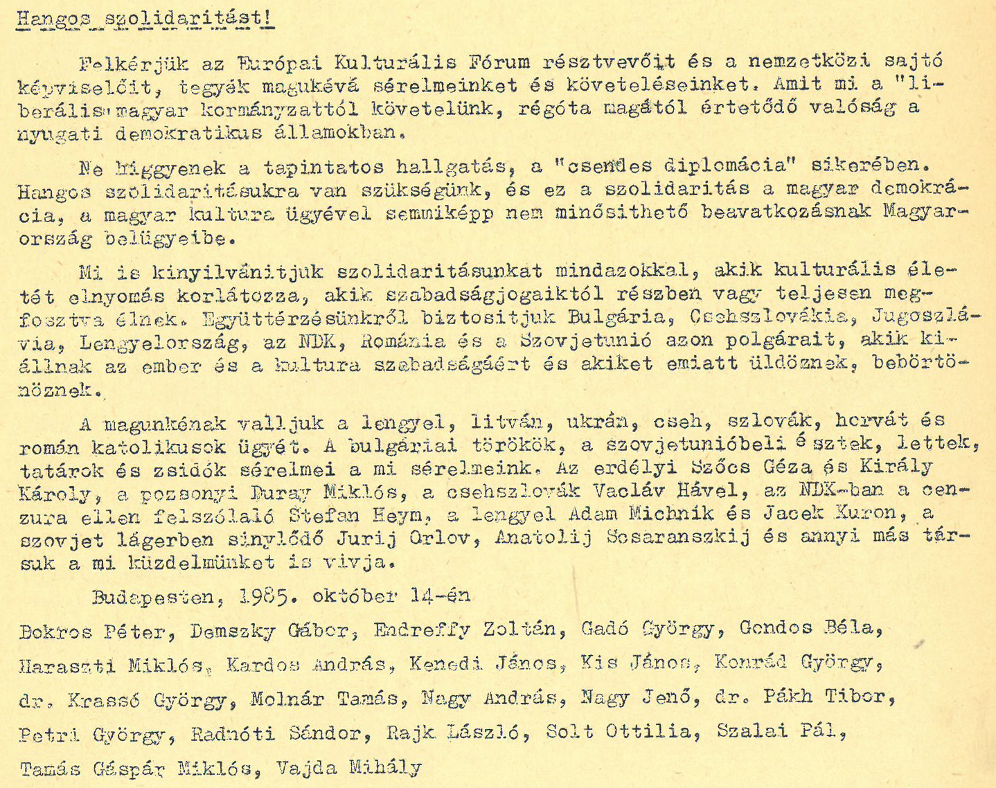 In 1985, on the 10th anniversary of the Helsinki Accords, Budapest hosted the European Cultural Symposium, a formal diplomatic event addressing the efficacy of the third (humanitarian) basket of the Helsinki Accords. The IHF organized a counter-symposium, the Unofficial Cultural Symposium, attended, besides Hungarian intellectuals, by the likes of Susan Sontag, Danilo Kiš, or Pavel Kohout. The Hungarian authorities in the last moment banned the counter-symposium, which then took place in private apartments. Exploiting the international attention, prominent figures of the Hungarian democratic opposition issued an appeal objecting the presumption that human rights violations in Hungary were over, expressing subtle criticism of the Final Act as well. Owing to IHF, the text was handed out and partly read out also at the parallel "discreet" diplomatic event; the Lajos Jakab Samizdat Collection holds a typewritten original of the appeal, which later was published in the samizdat journals Beszélő and Hírmondó, and also in the official publication of the Unofficial Symposium, among the conference lectures, in English.
