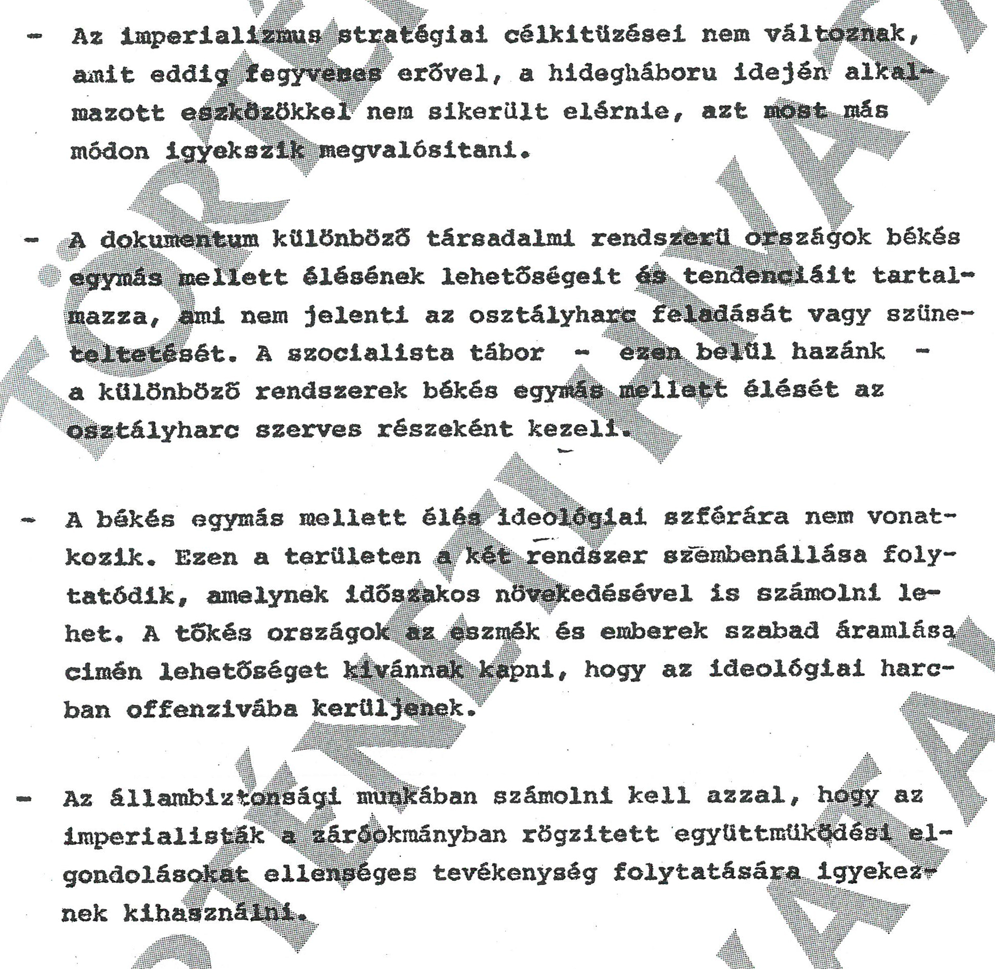 "Capitalist states hope to exploit the opportunity provided by the free flow of ideas and people to launch an ideological offensive. State security must be aware that the Imperialists intend to capitalize on the contents of the Final Act in pursuing hostile endeavors."