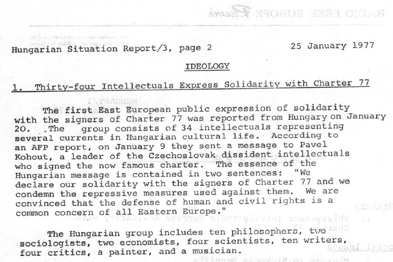 In 1976, the year after the Helsinki Accords was signed, the Moscow Helsinki Group was formed in the USSR, soon followed by similar groups throughout the country. The Workers' Defence Committee was established in Poland, and signatures were collected in Czechoslovakia reinforcing a political text. In January 1977, the text entitled Charter 77 was published in Western journals and read out on Radio Free Europe, as a result of which an authentic copy is preserved at Blinken OSA. Signed by 243 individuals, Charter 77 protested the violations of the very human rights recorded in the Final Act. The organizers were detained and imprisoned, which sparked Hungarian intellectuals to take a stand by issuing a two-sentence long statement of solidarity saying, "We declare our solidarity with the signers of Charter 77 and we condemn the repressive measures used against them. We are convinced that the defense of human and civil rights is a common concern of all Eastern Europe." In secret, 34 signatures were collected in support of the statement then sent out to the journal Le Monde. The RFE Situation Report on the case is accessible in the Archive's Digital Repository: