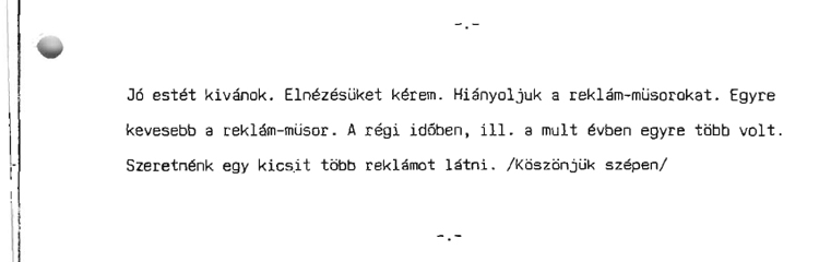 Channel 2 of the Hungarian Television maintained an answering machine for audience feedback, like “Good evening. Sorry to interrupt. We miss ads. There are less and less ads. In the past period, or last year, there were gradually more. We'd like to see a little more ads. (Thank you)”.