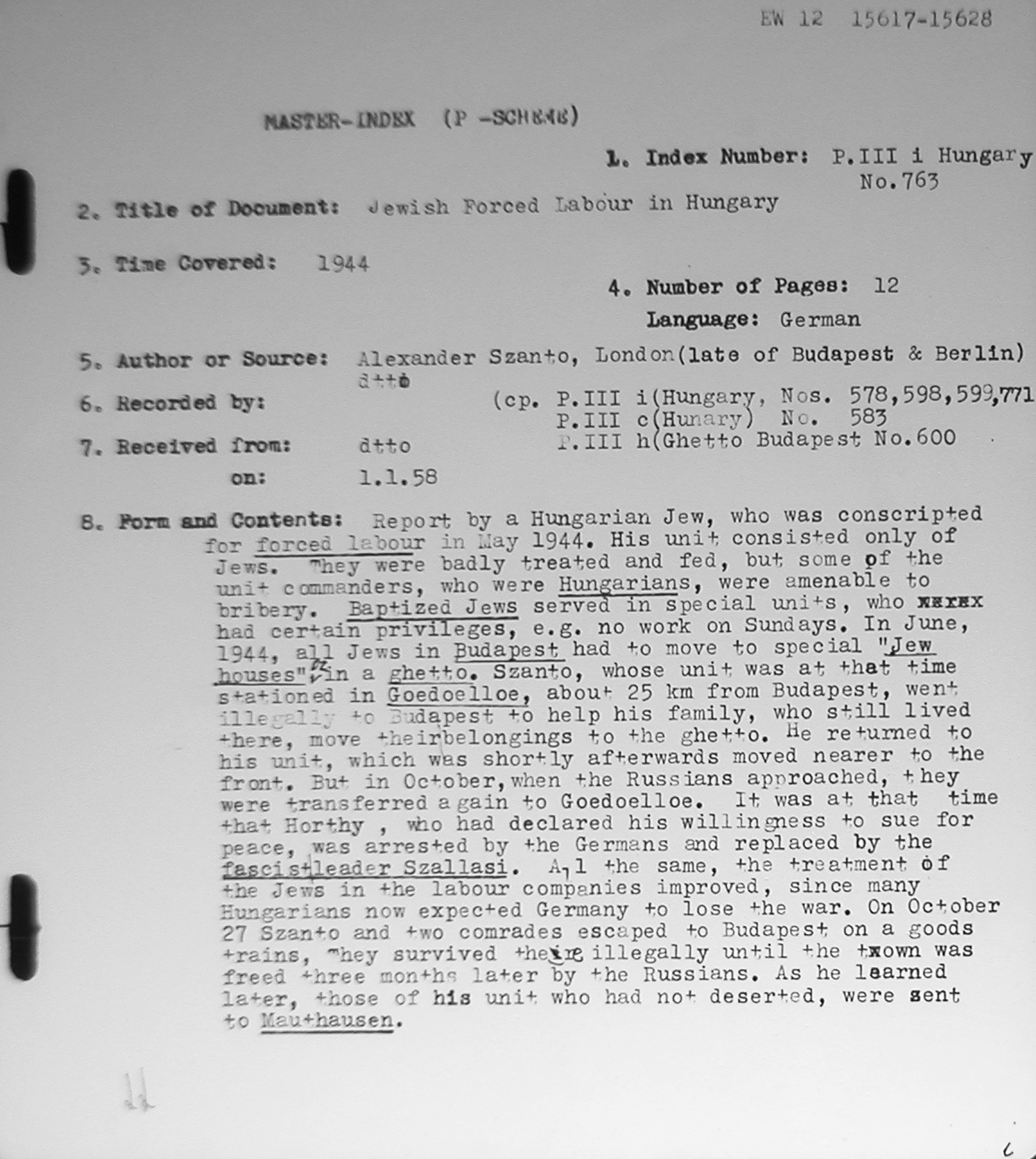 The Wiener Library in London is the world's oldest Holocaust memorial institution. It documents the history of the Nazi movement, crimes against the Jewish people, and the history of European Jewry. OSA holds a copy of the collection “Testaments to the Holocaust: Documents of The Wiener Library (London) on microfilm,” which consists of microfilmed library materials, thematic press cuttings, biographical files, photo collection, personal reports and interviews.