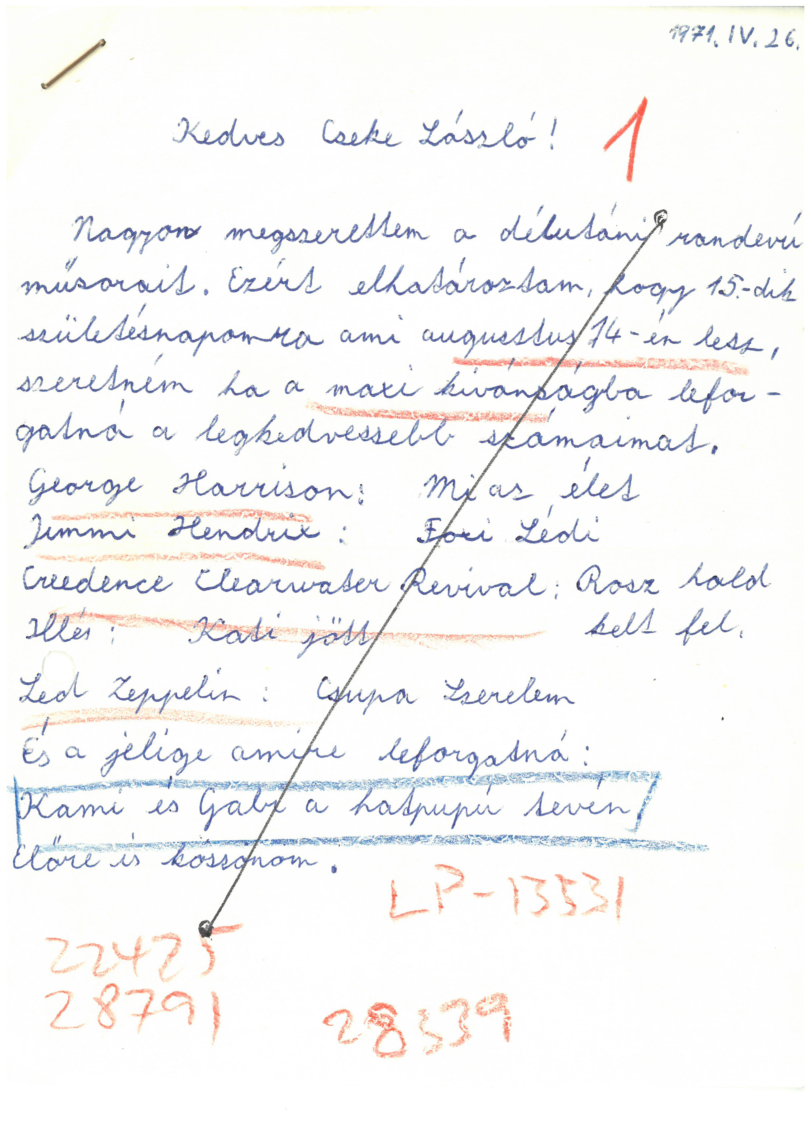 A lemezlovas asztalára zsákszámra érkeztek a jeligés ("Ditta, az aknavetős lány", "Lökhajtásos fogkefe", "Yo-Yo és Miki, a két halszemű ródlibajnok") kérések, rendszerint egy-egy kedves, érzelmes, vagy éppenséggel bugyuta történettel indokolva, hogy küldőjének miért fontosak a kért zeneszámok. A Blinken OSA Archívum több mint 3.000 levelet, képes- és levelezőlapot őriz, amelyeket a Teenager Party (és kései változata, a Délutáni randevú) müncheni, illetve konspiratív okokból létrehozott, londoni postafiókjába küldtek a zenekedvelők 1971-1976 között.