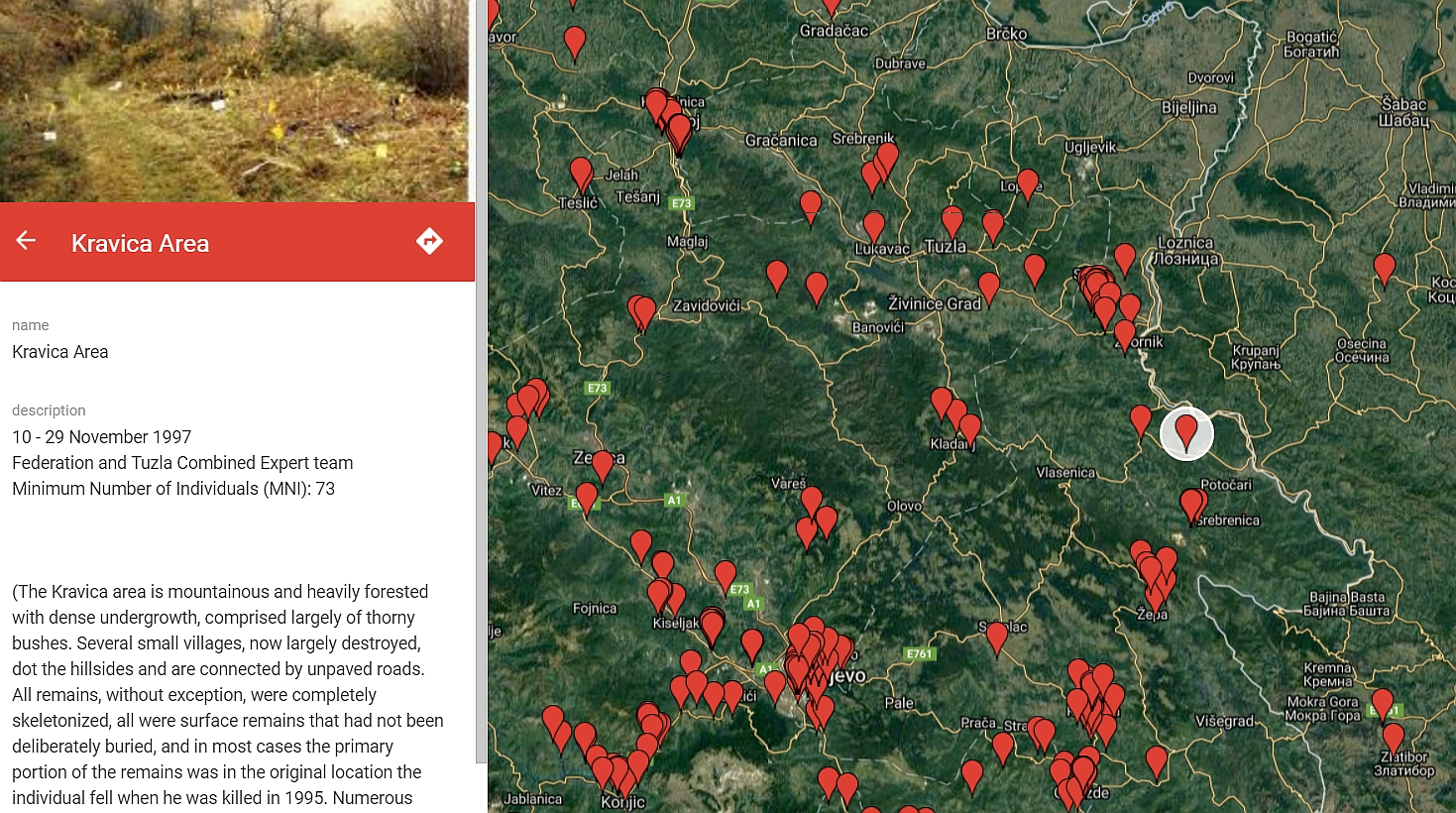 Based on a collection of 137 forensic reports produced by the Physicians for Human Rights (PHR) during its Forensic Assistance Project in Bosnia and Herzegovina in 1997-1999, Blinken OSA published published a map of over 500 individual and mass grave exhumation sites across the country. Complementing the work of the International Criminal Tribunal for the former Yugoslavia (ICTY) and the International Committee of the Red Cross (ICRC), PHR worked with local forensic teams to exhume and document mass grave sites that were not designated for investigation by other organizations, and to collect unique personal information on victims from families and match them with data collected from postmortem examinations.