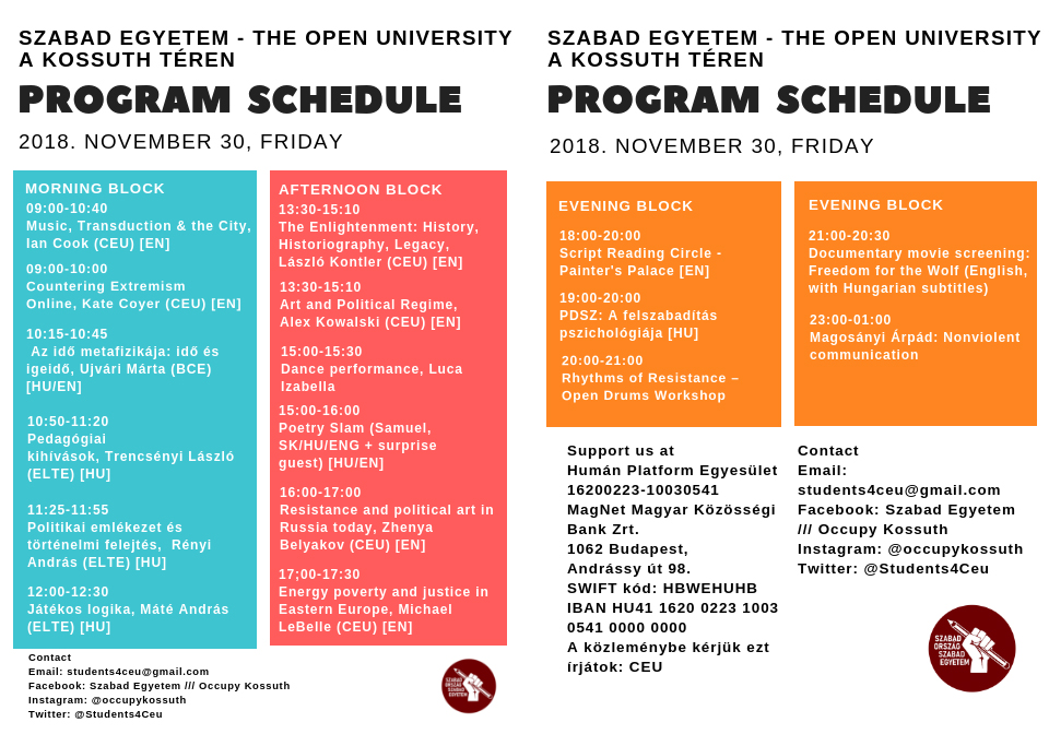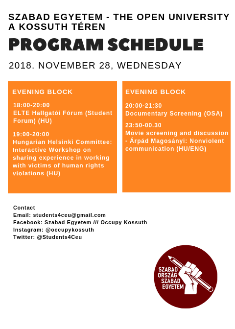 "At the conclusion of 24 November Tüntetés a Tudomány és az Oktatás Szabadságáért, we will remain on Kossuth Square. Throughout the next week we will occupy the heart of Hungarian political power, showing Orbán and Fidesz that our coalition is committed to freedom of thought and education in this country. Whether we leave or stay we remain committed to Hungary."