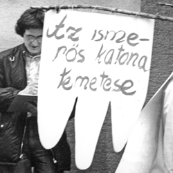 The Dialogue Peace Group was established in 1982 with the intention to launch a conversation between Eastern and Western peace movements divided by the Iron Curtain. Feeling threatened by the group’s growing popularity, the Hungarian state launched a series of intimidating actions against members in 1983, resulting in the group’s dissolution. Providing insight into the post-dissolution period of the Dialogue Peace Group, this photo series captures the street happening titled Funeral of the Known Soldier, performed by members on October 29, 1983.